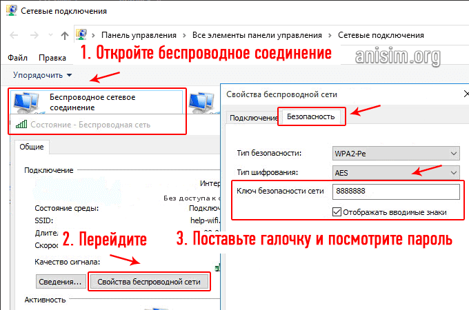 2. У списку знайдіть активне бездротове підключення і відкрийте його. У вікні натисніть кнопку, що відкриває “властивості бездротової мережі”. Тут перейдіть на вкладку «безпека» і встановіть галочку біля пункту відображення вводяться знаків.