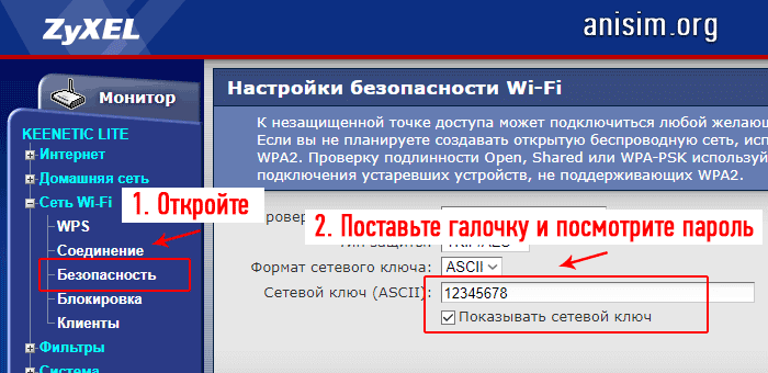2. В меню перейдіть в розділ управління бездротовим з’єднанням / wifi і відкрийте підрозділ “безпека” або зі схожою назвою. У вікні ви побачите поле з назвою, що включає слово ключ або пароль, поставте поруч з ним галочку, яка дозволяє відобразити його.