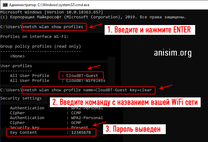 4. Далі вбийте наступну команду — netsh wlan show profiles name=»название_вашей_вай_фай_сети» key=clear
